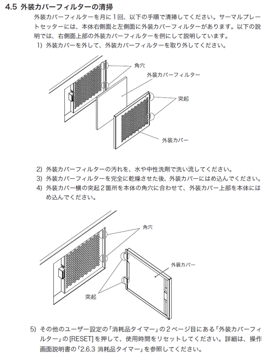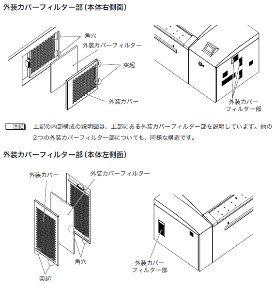 (詳細は、取扱説明書の「4.5 外装カバーフィルターの清掃」を参照してください。)