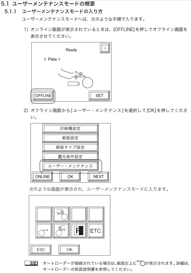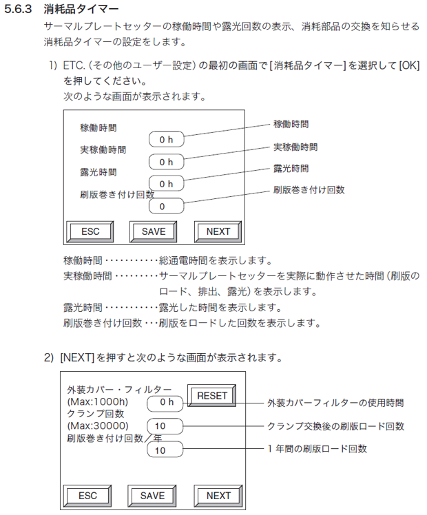 5) 消耗品タイマーの情報を保存するときは[YES]を押してから [OK]を押してください。 データが保存され、ETC.(その他のユーザー設定)の最初の画面に戻ります。 [ESC]を押すと1つ前の画面に戻ります。 [ONLINE]を押すとオンライン画面に戻ります。