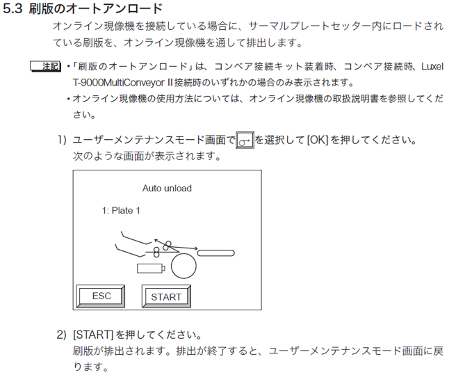版が排出の時は、自動現像機に挿入されないように注意してください