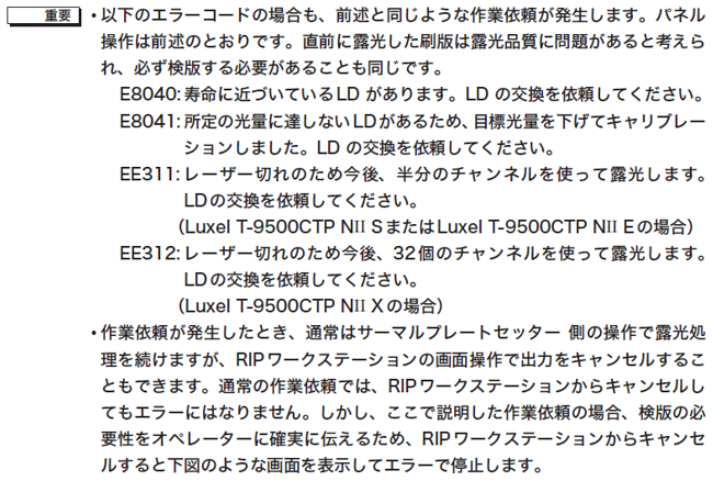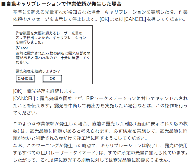 E8046: 許容範囲を大幅に超えるレーザー光量のズレを検知したため、 キャリブレーションを実行しました。 直前に露光されたxx枚の刷版は露光品質に問題があると思われるので、 十分に検版してください。 「自動キャリブレーションで作業依頼が発生した場合」を参照してください。