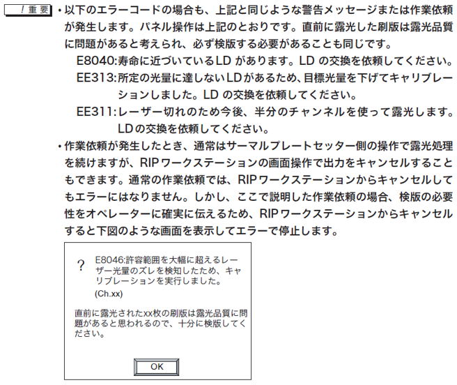 E8046: 許容範囲を大幅に超えるレーザー光量のズレを検知したため、 キャリブレーションを実行しました。 直前に露光されたxx枚の刷版は露光品質に問題があると思われるので、十分に検版してください。 「自動キャリブレーションで作業依頼が発生した場合」を参照してください。